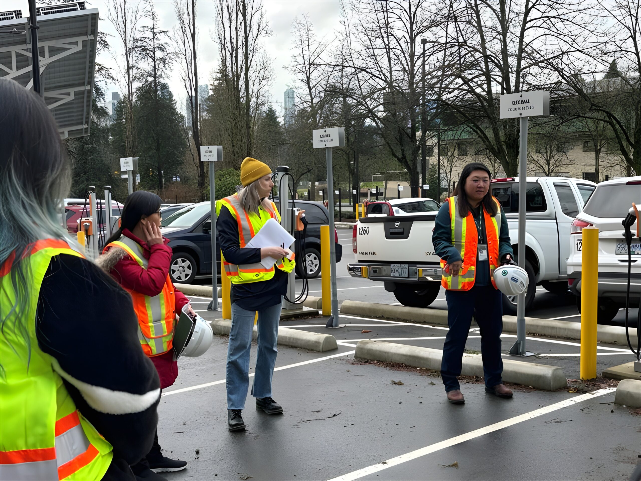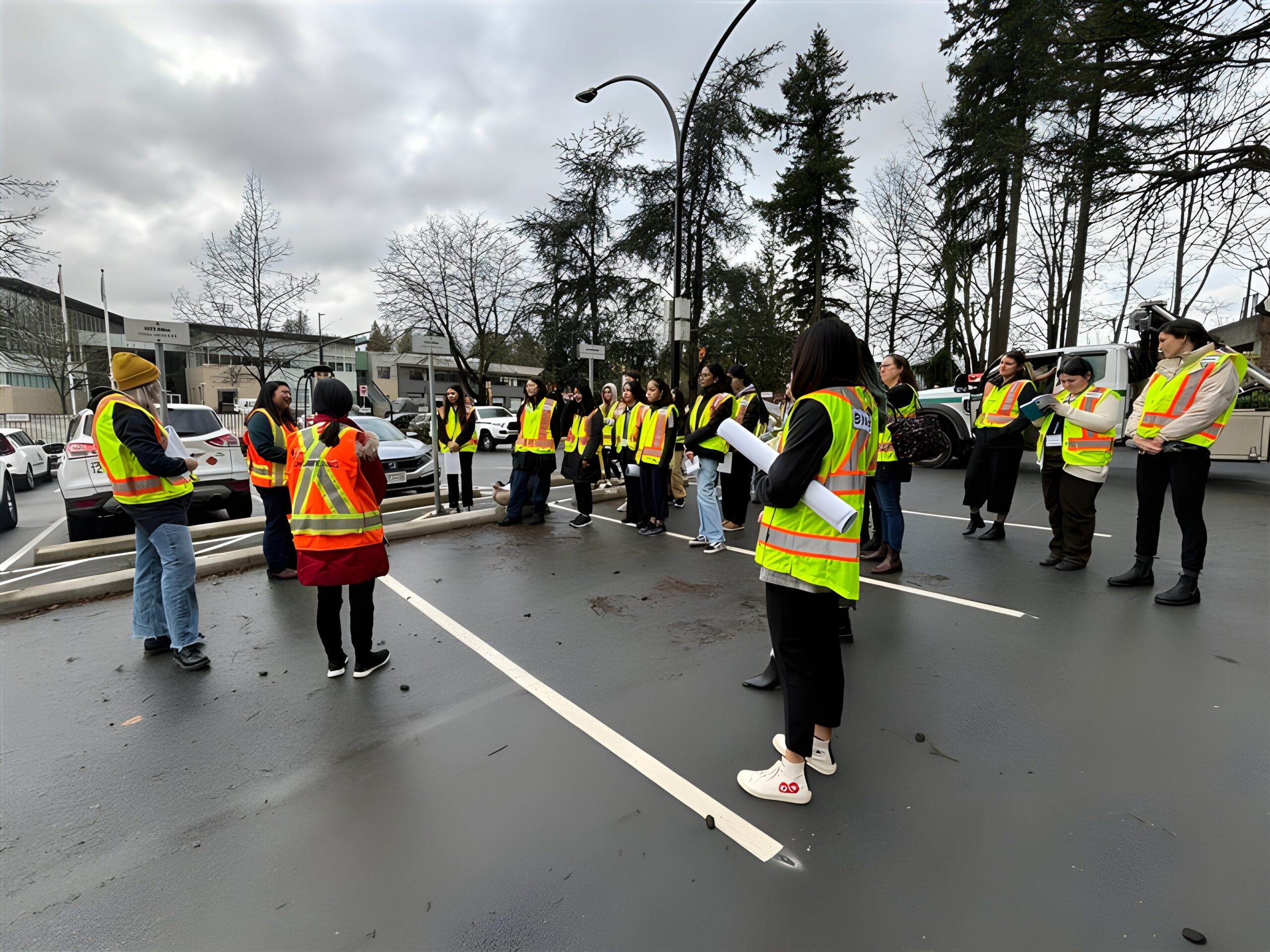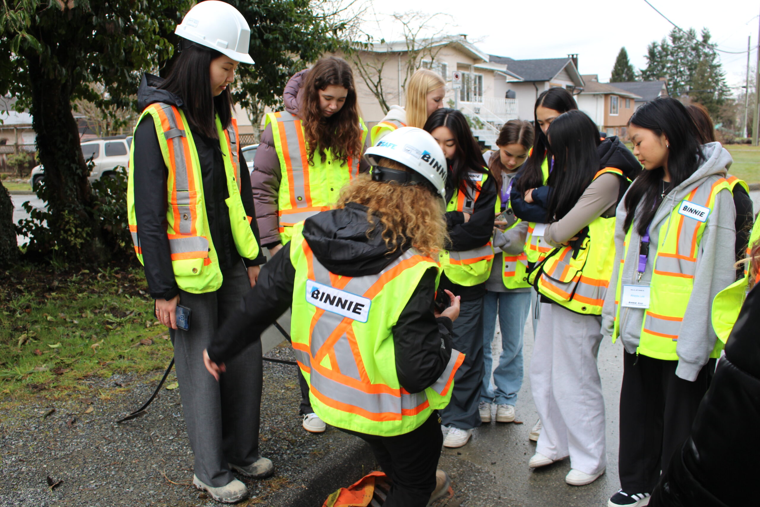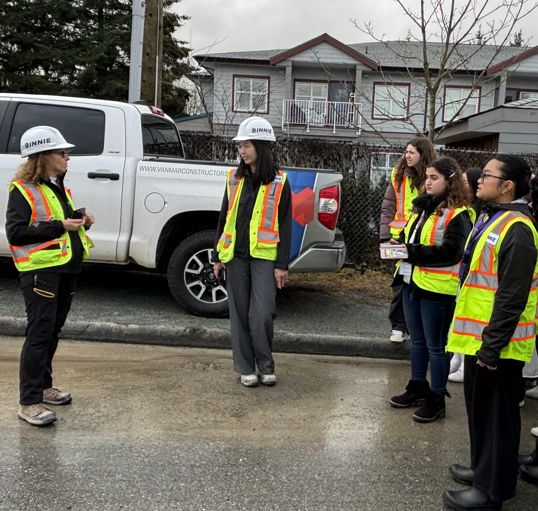 Our students also received the opportunity to tour and learn about two Binnie projects. One group walked to Burnaby City Hall to learn about Binnie’s contributions to the award-winning “EV Chargers and Solar Canopy Project,” while another group visited the “YWCA Housing Project” to learn about erosion sediment control.