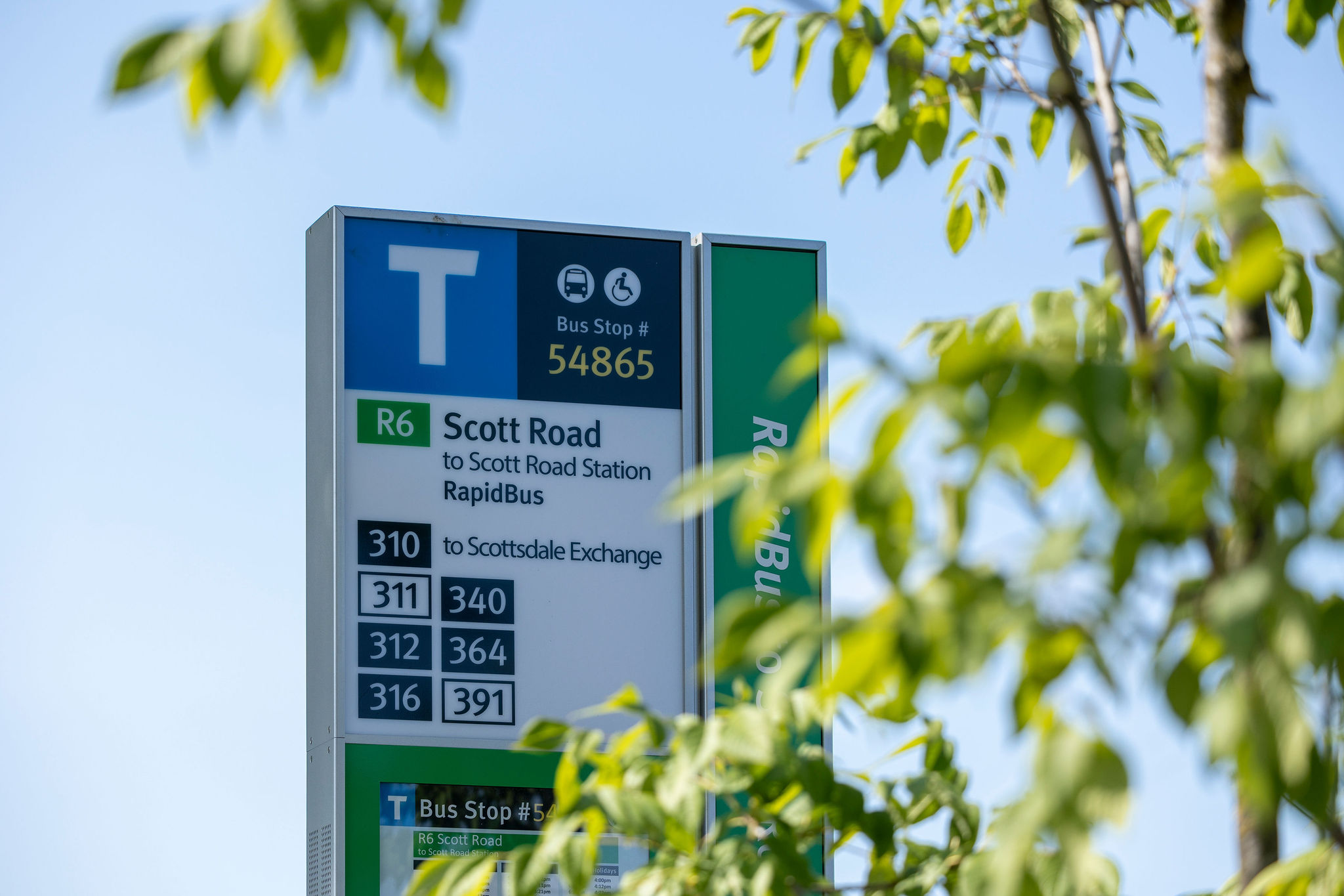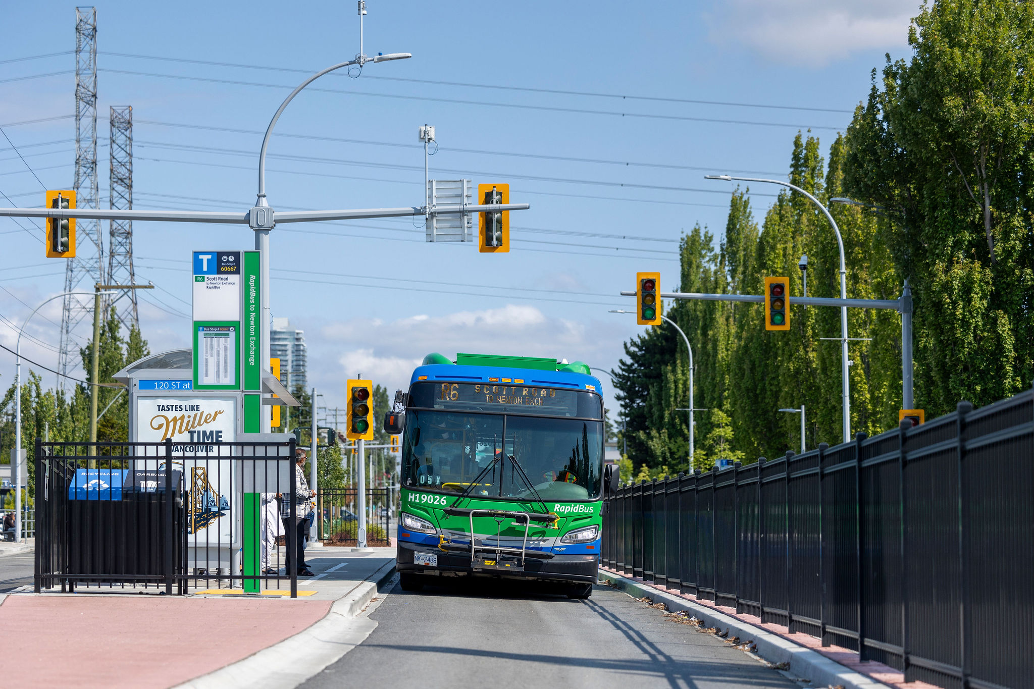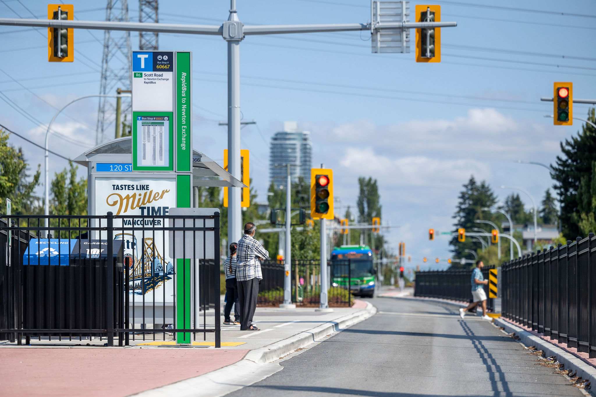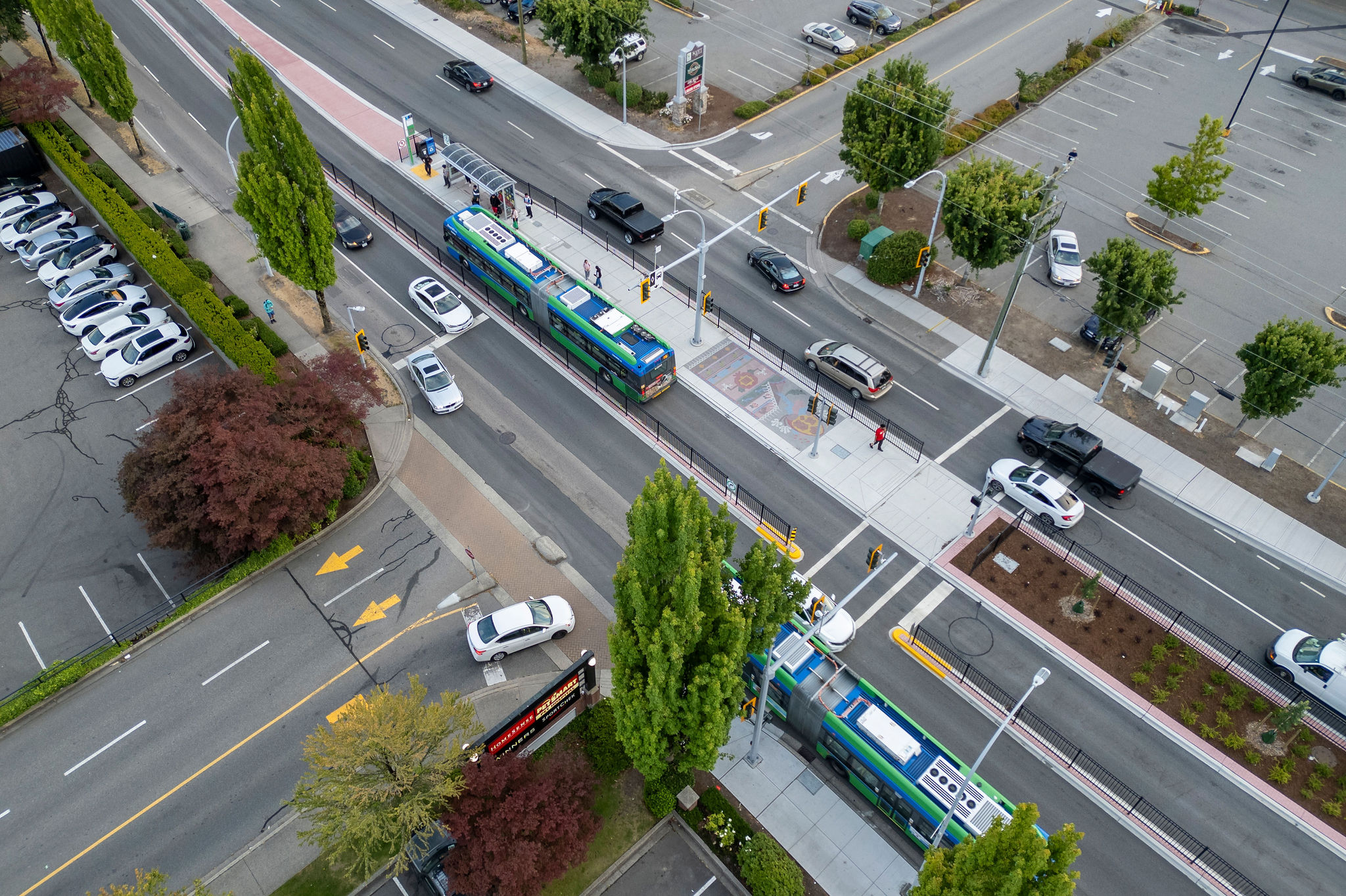 - Innovative transit priority solutions, such as the flagship median island bus stop at Scott Road and 72 Avenue Seamless transitions from curbside to center-running bus lanes for smooth vehicle and bus flow